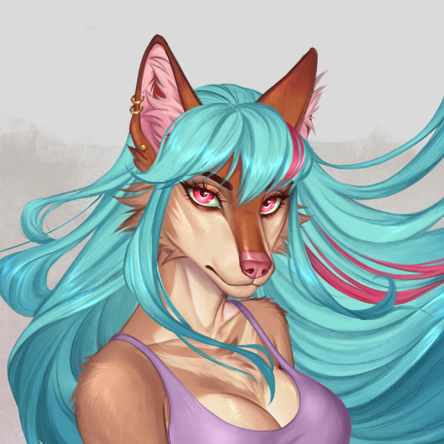 My name is Aria, I go by she/her. I am a fulltime freelancer artist living in Brazil.My main fursona is a female ethiopian wolf with blue hair.